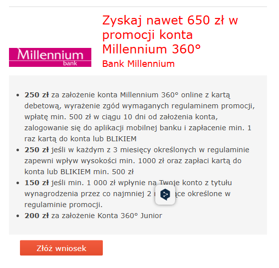 - 250 zł za założenie konta Millennium 360° online z kartą debetową, wyrażenie zgód wymaganych regulaminem promocji, wpłatę min. 500 zł w ciągu 10 dni od założenia konta, zalogowanie się do aplikacji mobilnej banku i zapłacenie min. 1 raz kartą do konta lub BLIKIEM.